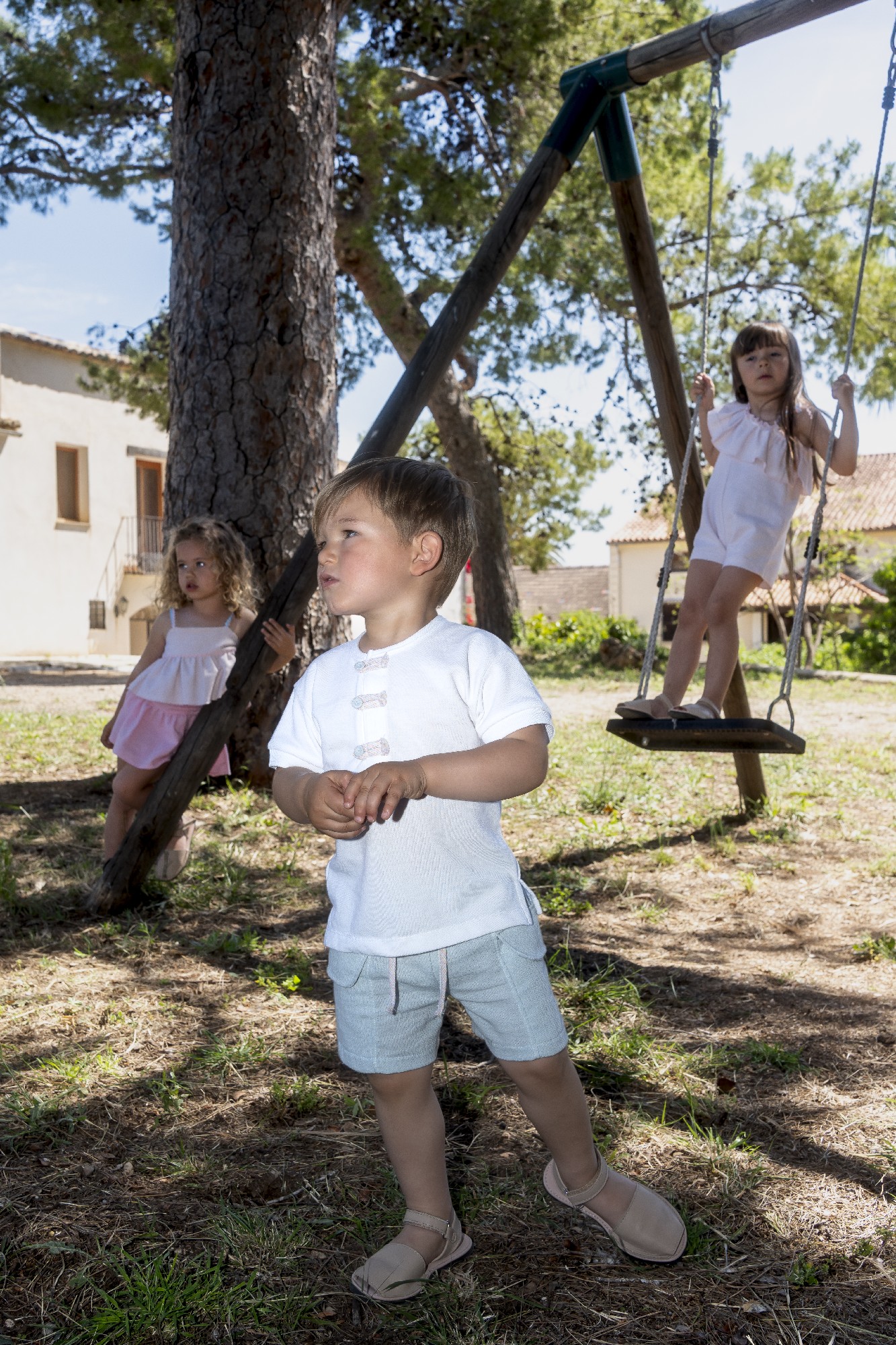 Este conjunto de dos piezas está diseñado pensando en la libertad de movimiento y la delicadeza que la piel de tu bebé necesita durante los días soleados: