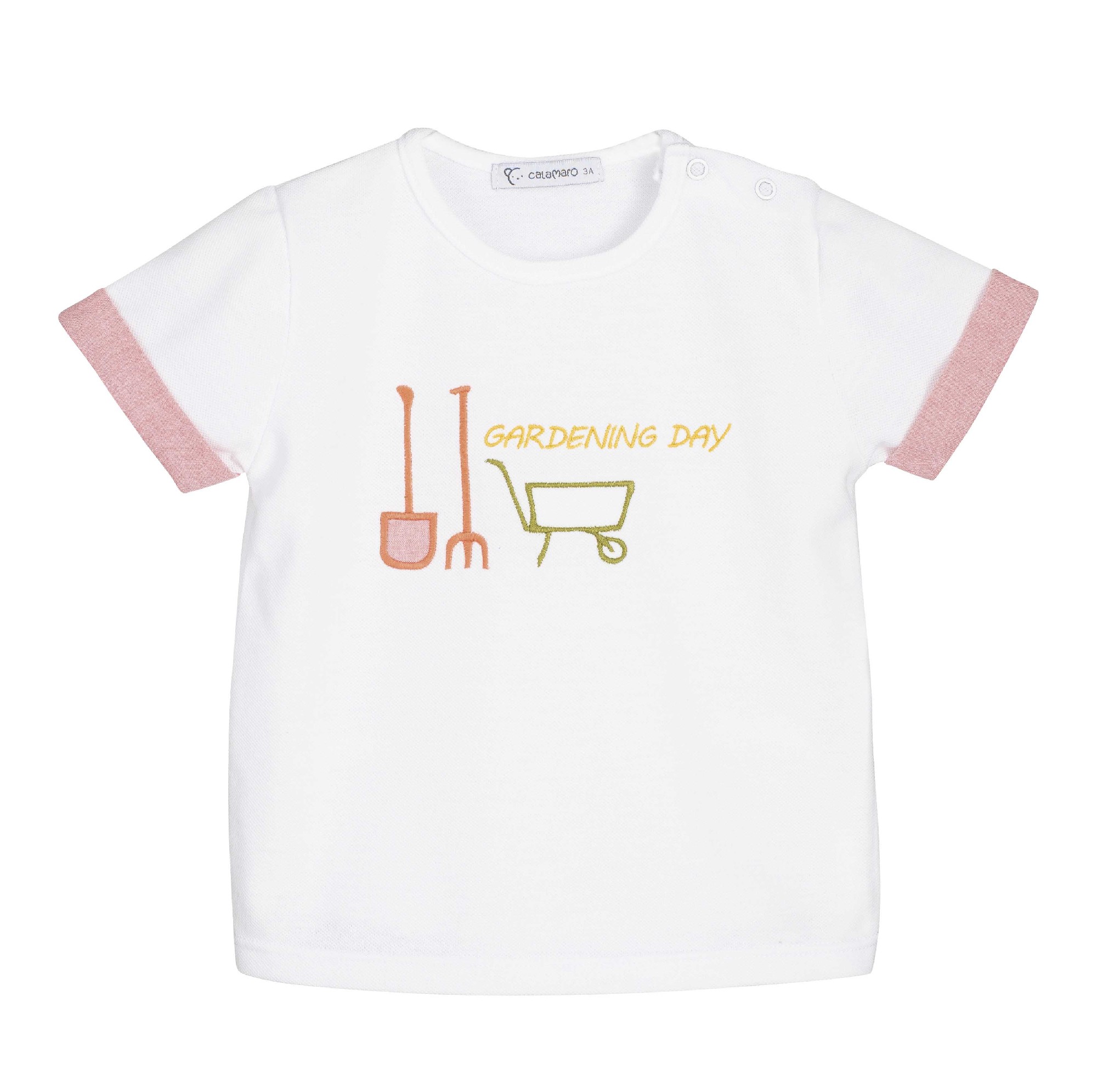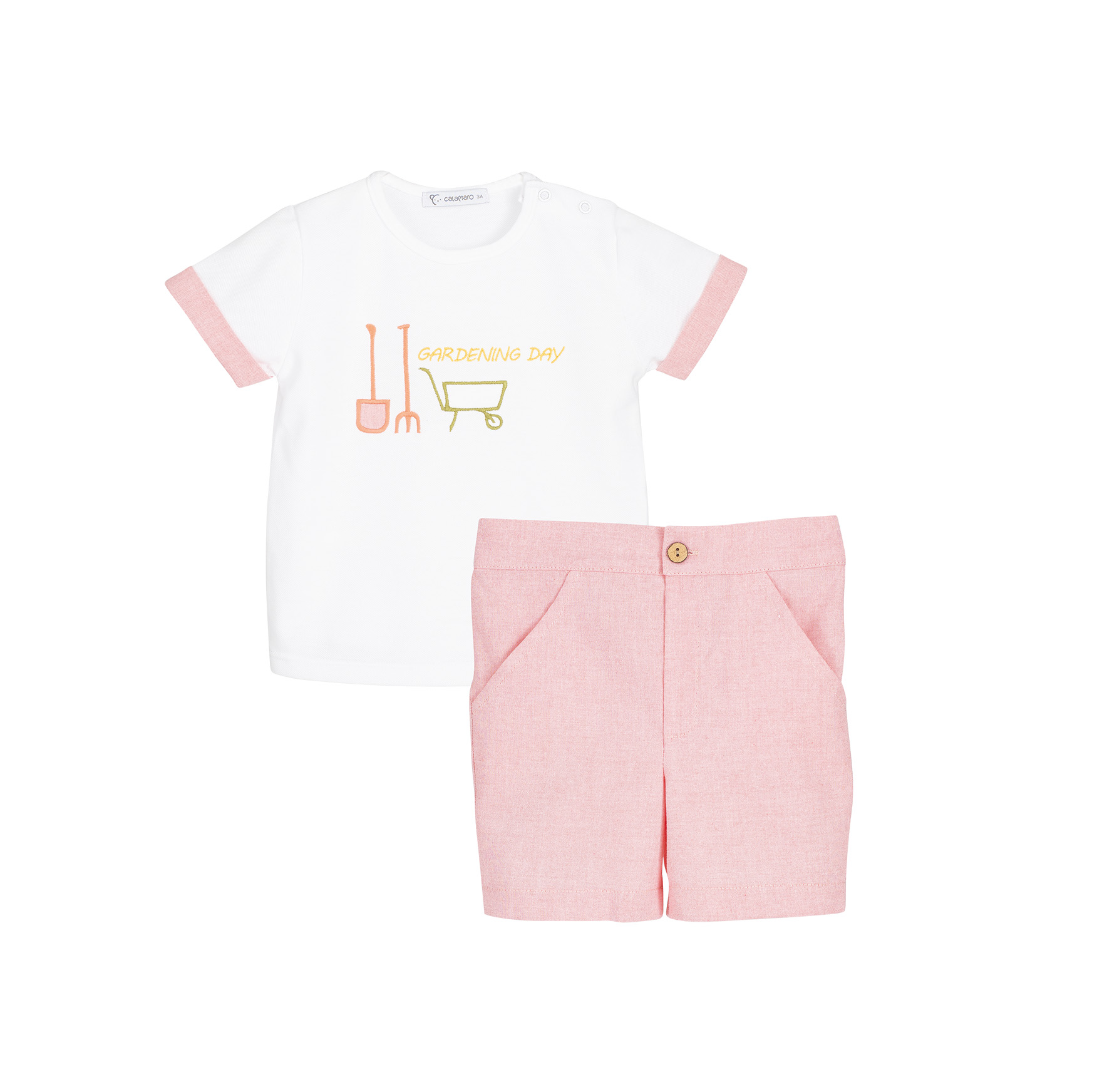 Está formado por una camiseta blanca de manga corta, con detalle de mangas en tono rosa empolvado y un dibujo bordado “Gardening Day”, y un short a juego en el mismo tono suave, ligero y cómodo. Un conjunto pensado para que los peques se muevan con libertad y estén fresquitos durante todo el día.