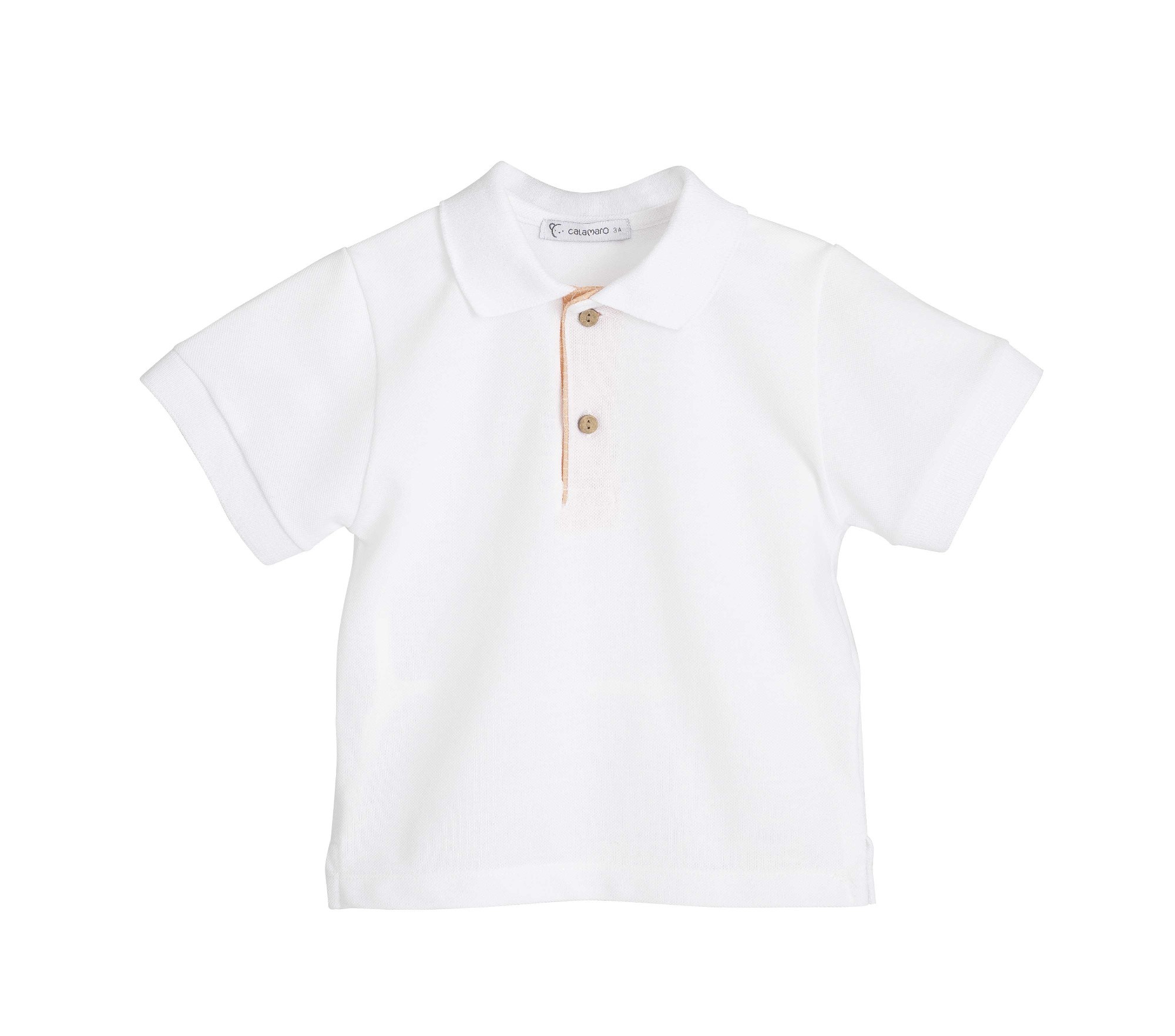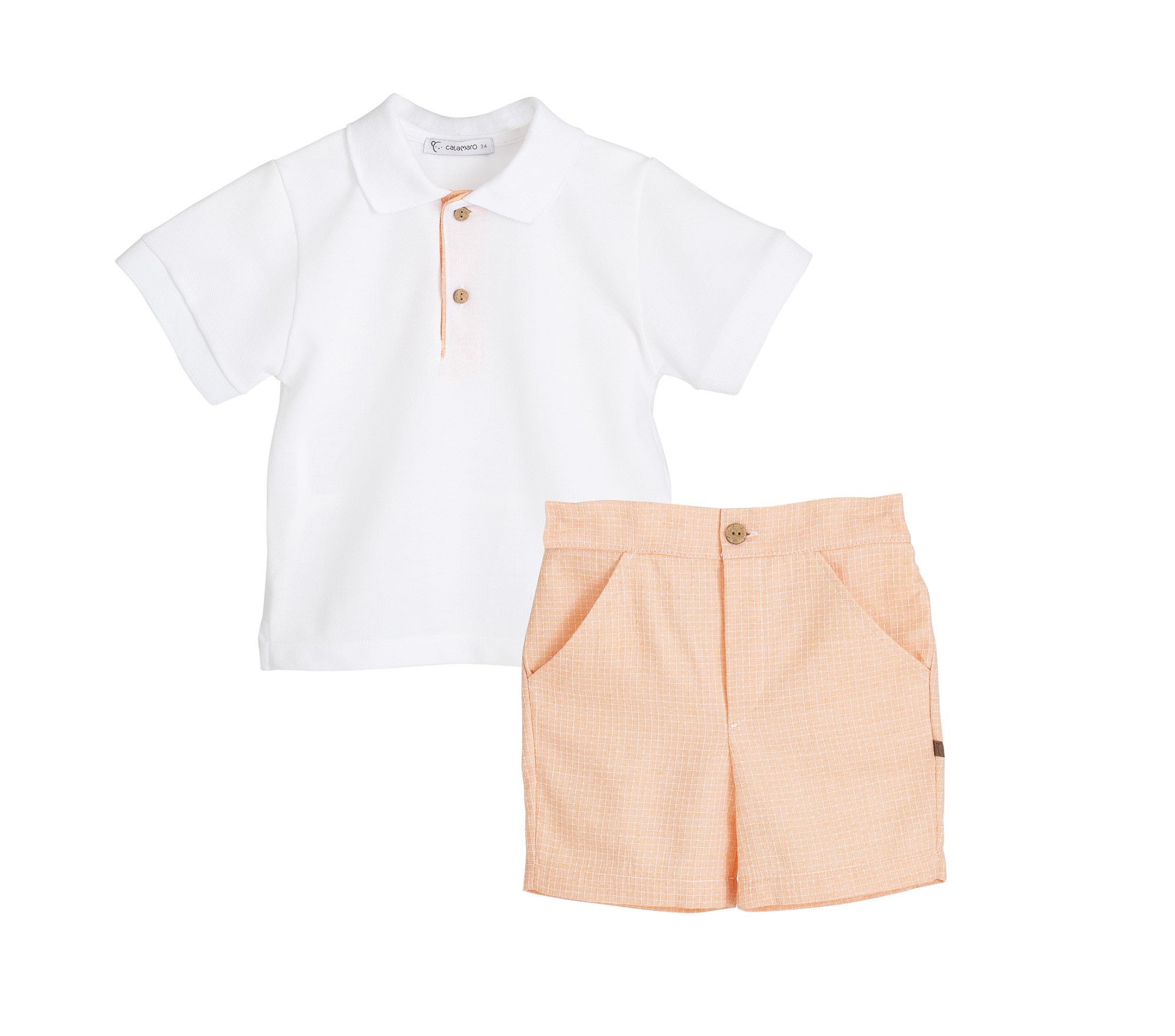 Conjunto de niño de la familia Delhi de la marca Calamaro, ideal para los días más especiales del verano. Está formado por un polo blanco de manga corta, con cuello clásico y botones delanteros, combinado con un pantalón corto en tono melocotón con delicado dibujo de cuadritos, creando un conjunto fresco, elegante y muy cómodo.