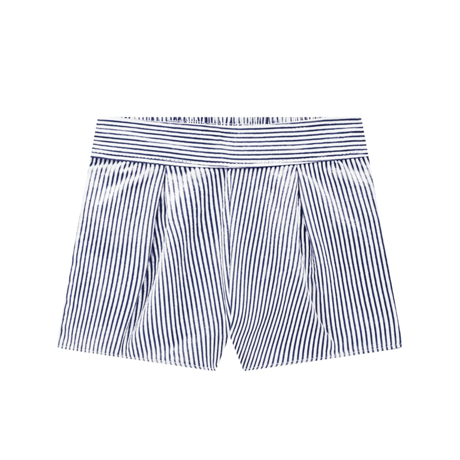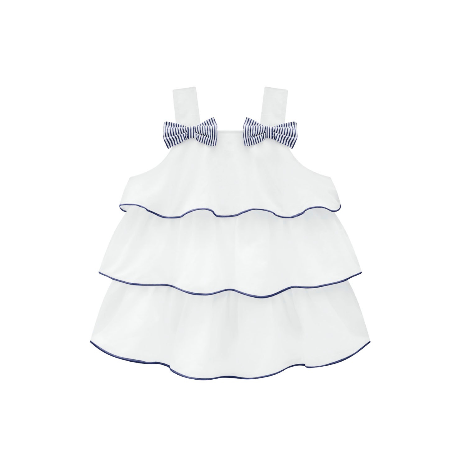 Conjunto pantalón corto blanco con rayas azul celeste y blusa en ondas con detalle lazos azules de rayas blancas.