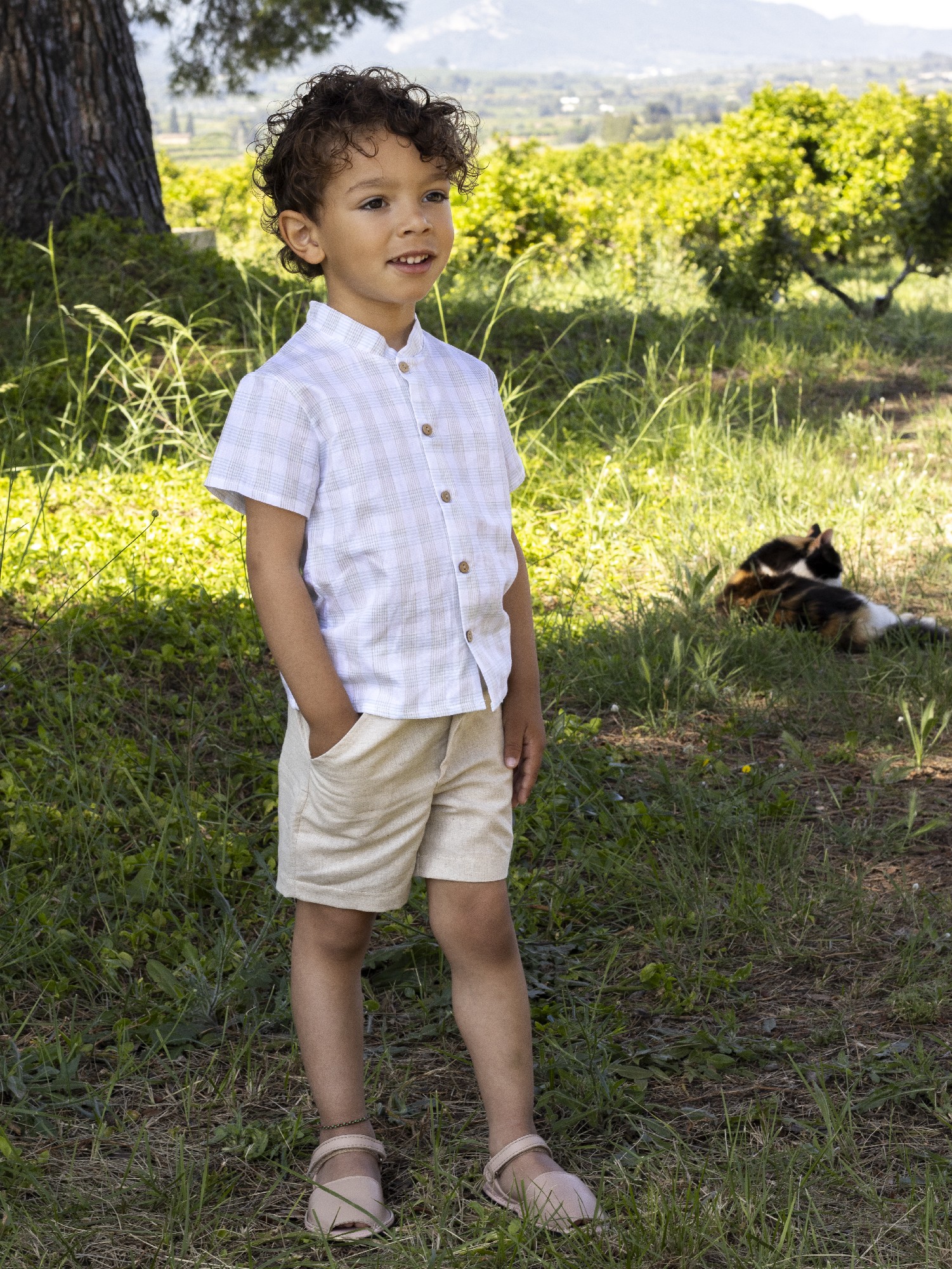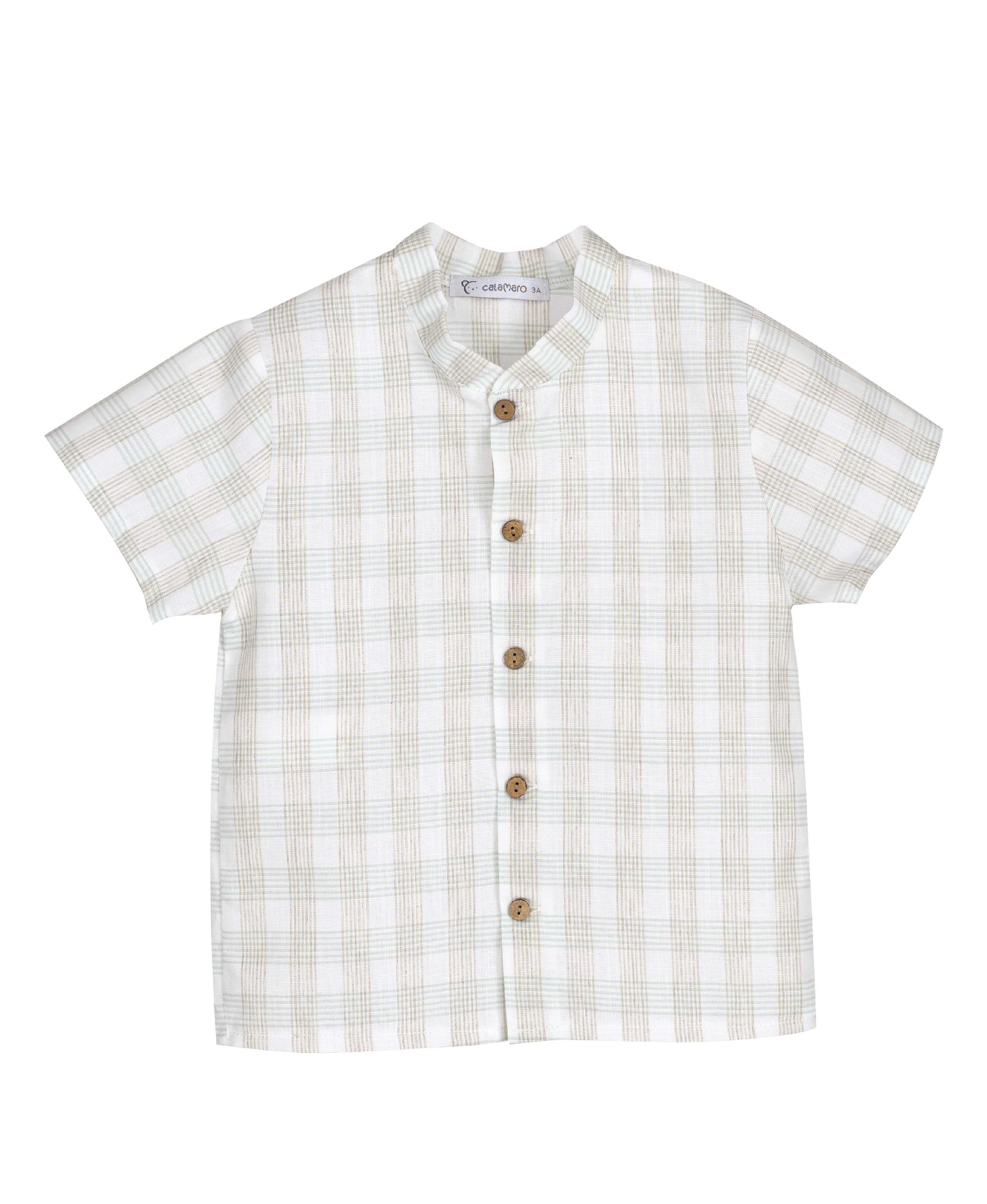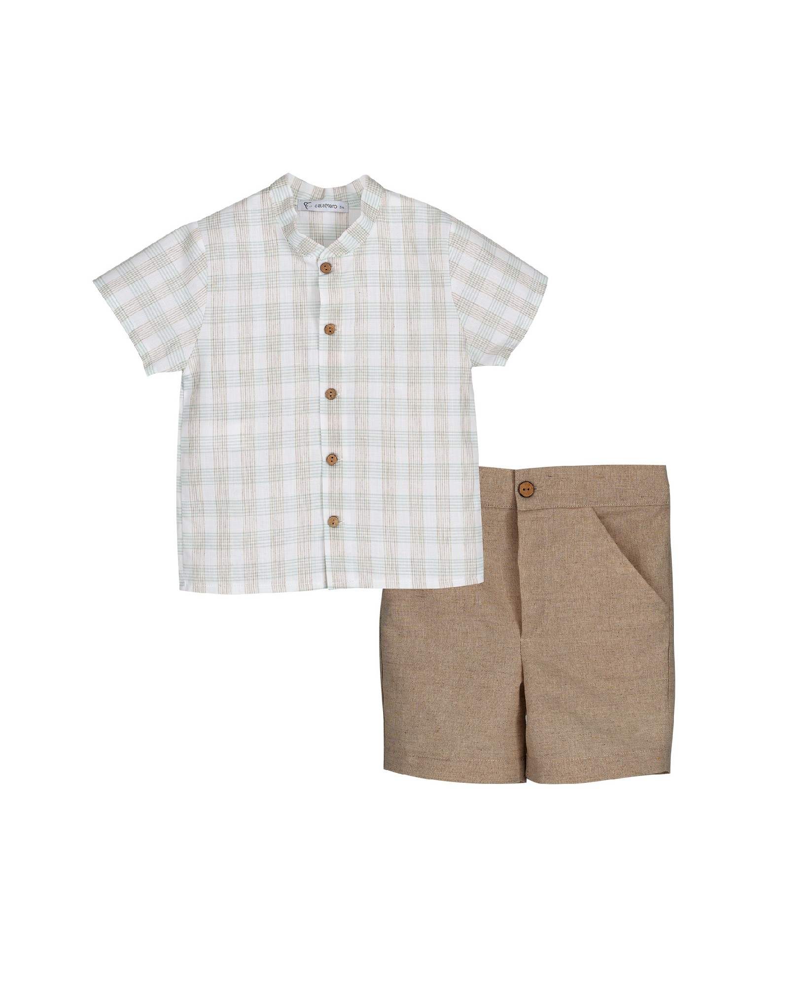 El conjunto de la colección Varanasi de la marca Calamaro es ideal para ocasiones especiales o un estilo de verano relajado , destaca por su diseño clásico u materiales naturales. Sé compone de una camisa cuadros vichy en tonos verde mint suaves y un pantalón corto color beige/natural.