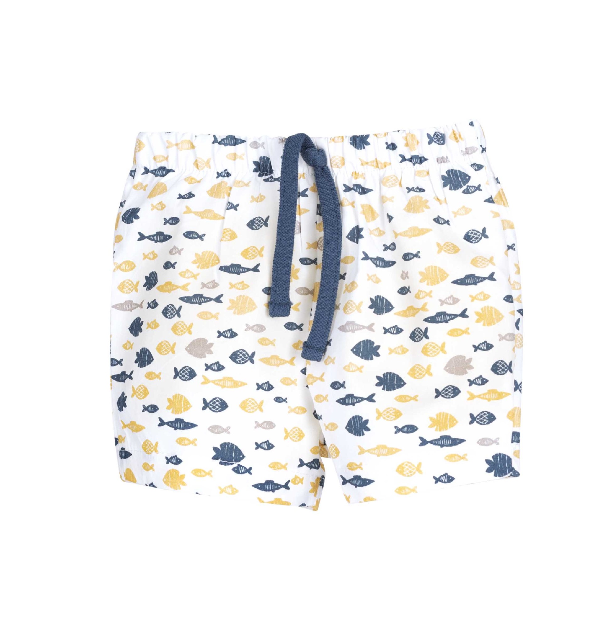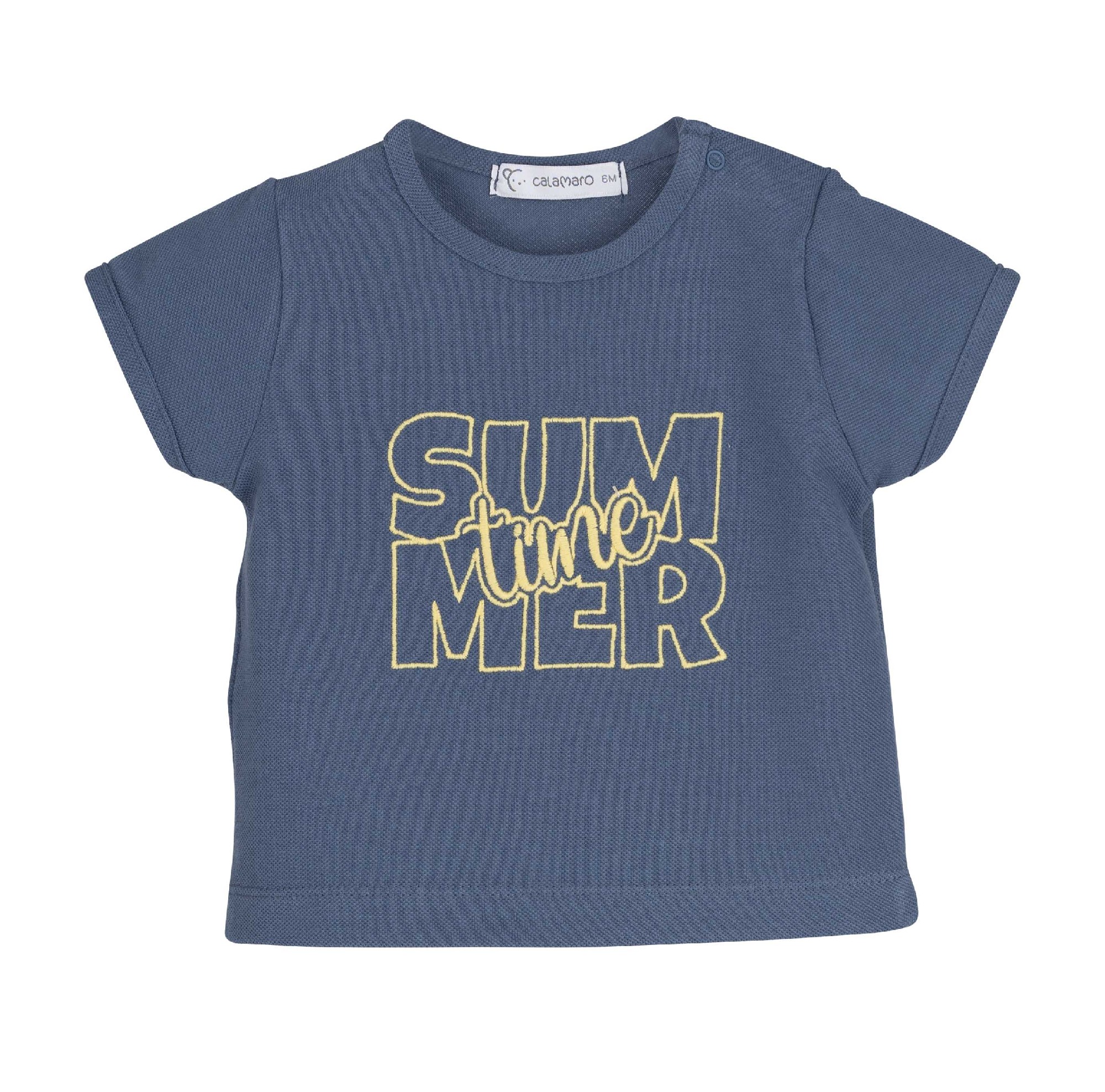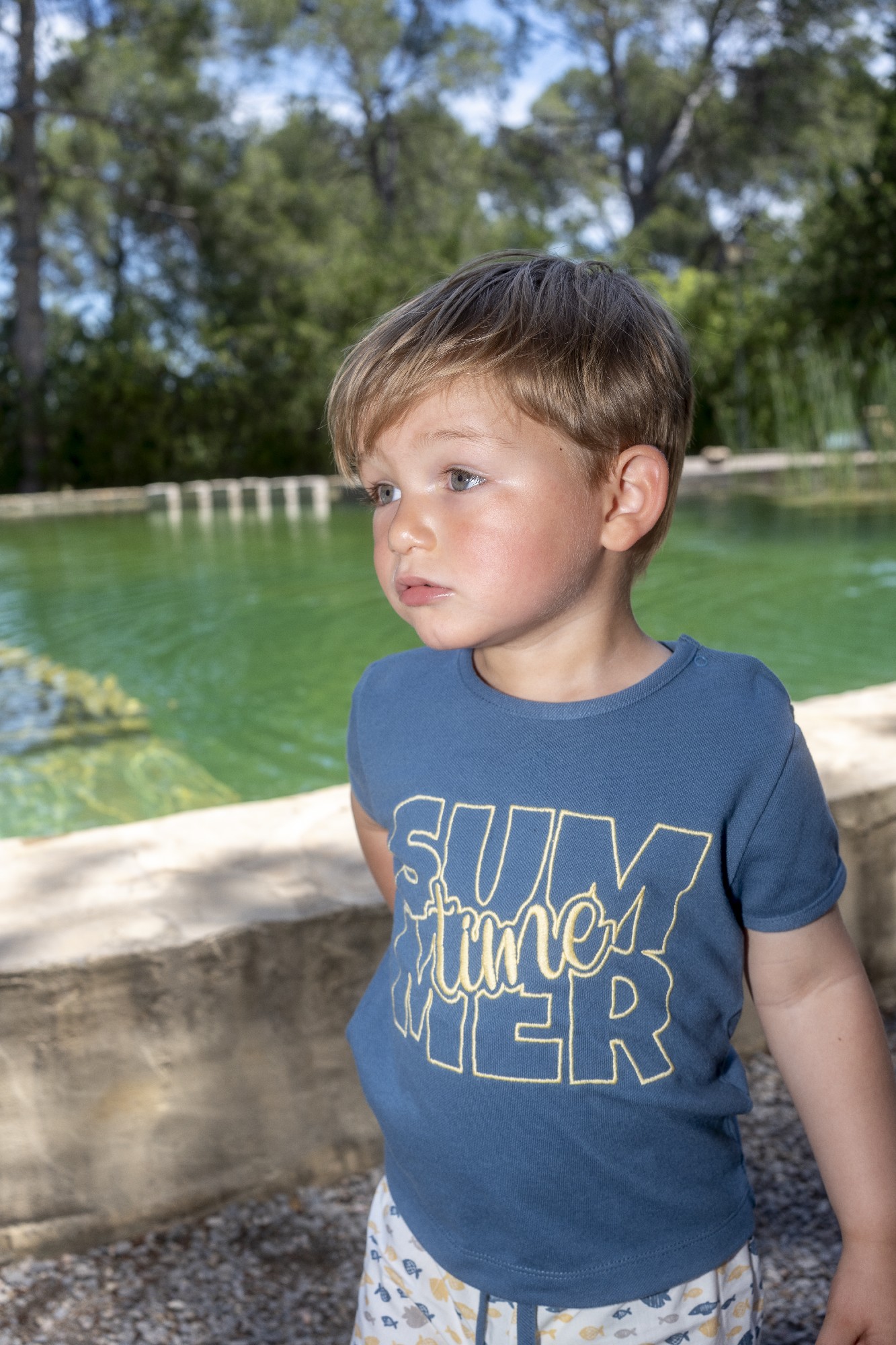 Conjunto infantil de la colección Calamaro Peces – Verano 2026, ideal para los días más cálidos. Está compuesto por una camiseta azul de manga corta con estampación “Summer Time” y un short blanco con divertido estampado de peces en tonos azules y amarillos.