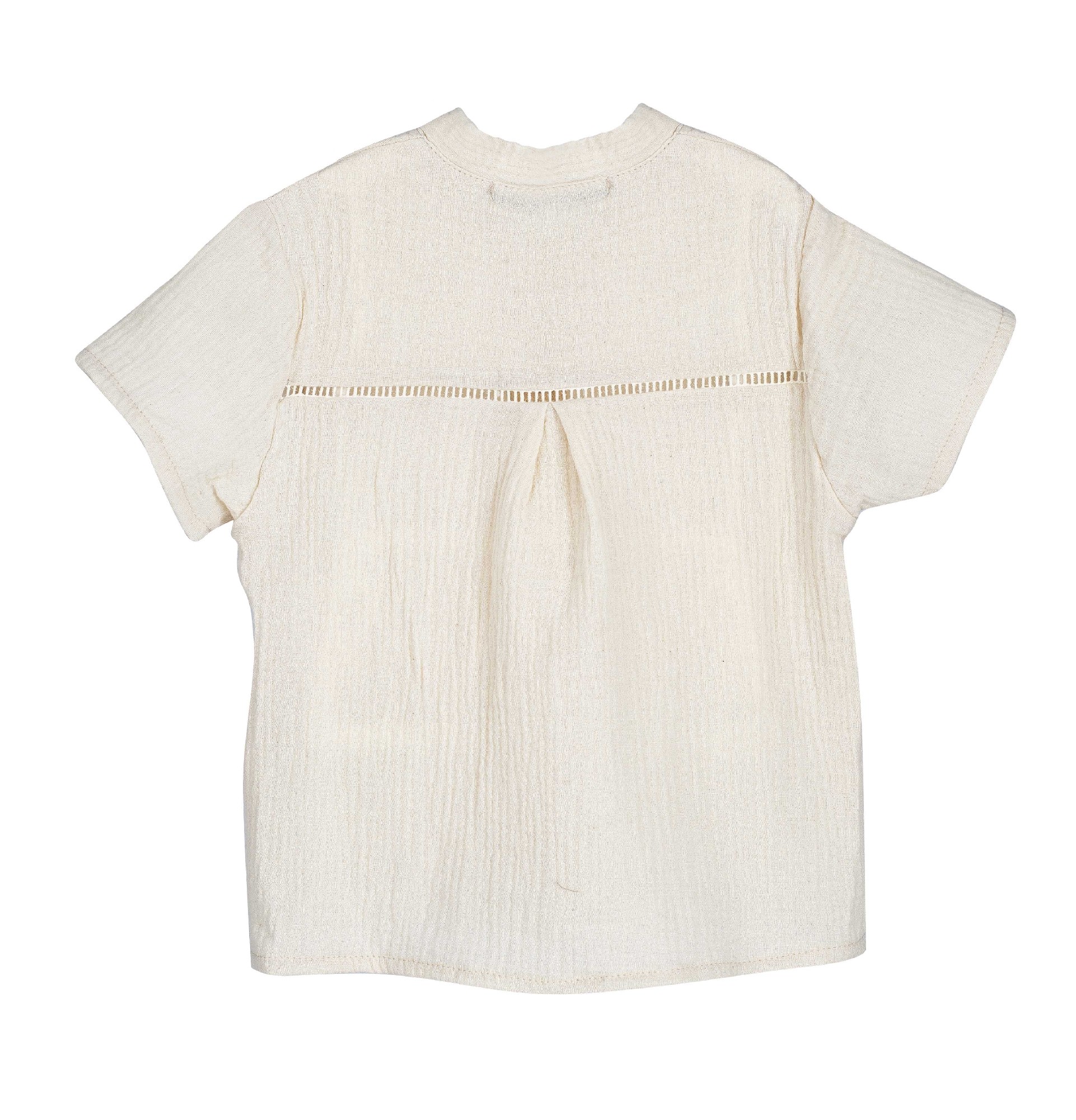 Camisa de manga corta ,presenta un cuello tipo mao y un cierre frontal de cinco botones oscuros que contrastan con el tejido claro.