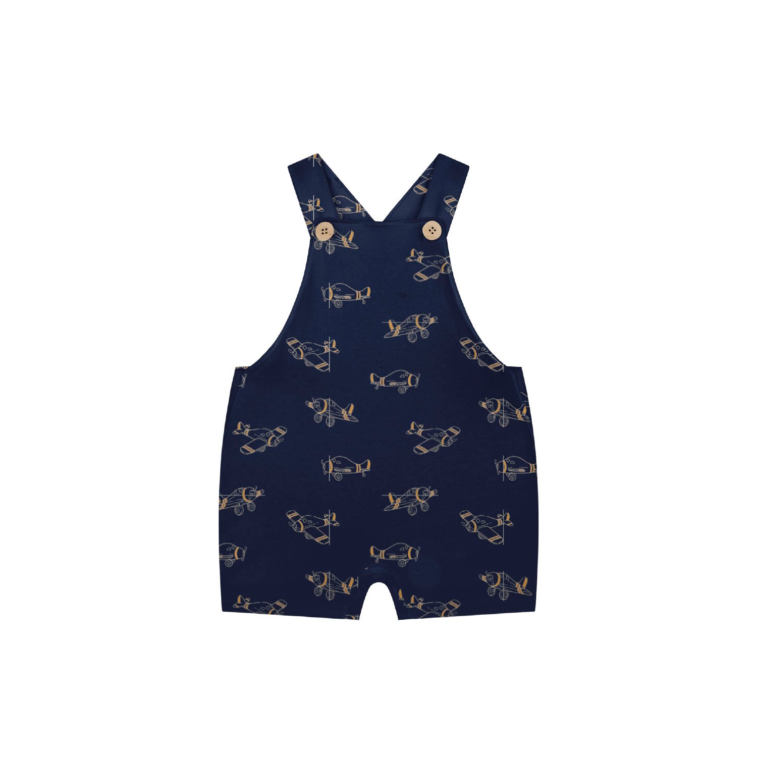 El peto es de color azul marino con un tono repetitivo de avionetas en color camel incluye el bodi de color camel