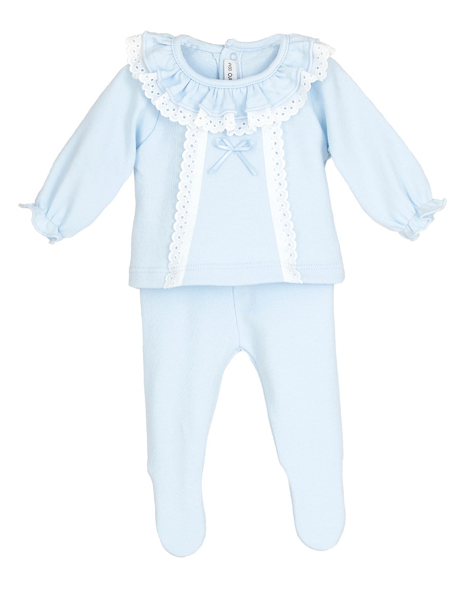 Diseñado para recién nacidos, está disponible desde la talla 00 (prematuro) hasta los 6 meses. Incluye camiseta de manga larga con diseño dulce y polaina a juego, confeccionado en tejido de algodón suave y transpirable.