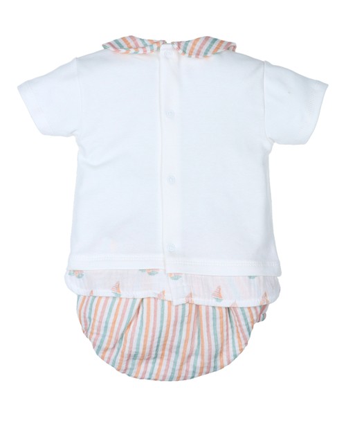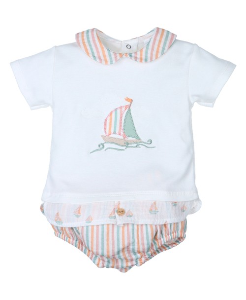 Conjunto de dos piezas de la marca Tony Bambina destaca por su colorido de verano , cuenta con un cuello bebe estampado en rayas a juego con su cubre pañal ranita. La camiseta luce en el centro un bordado de un velero que combina diferentes texturas y los mismos tonos que el cuello , en la parte baja termina con un diseño tipo camisa con un botón de color beige.