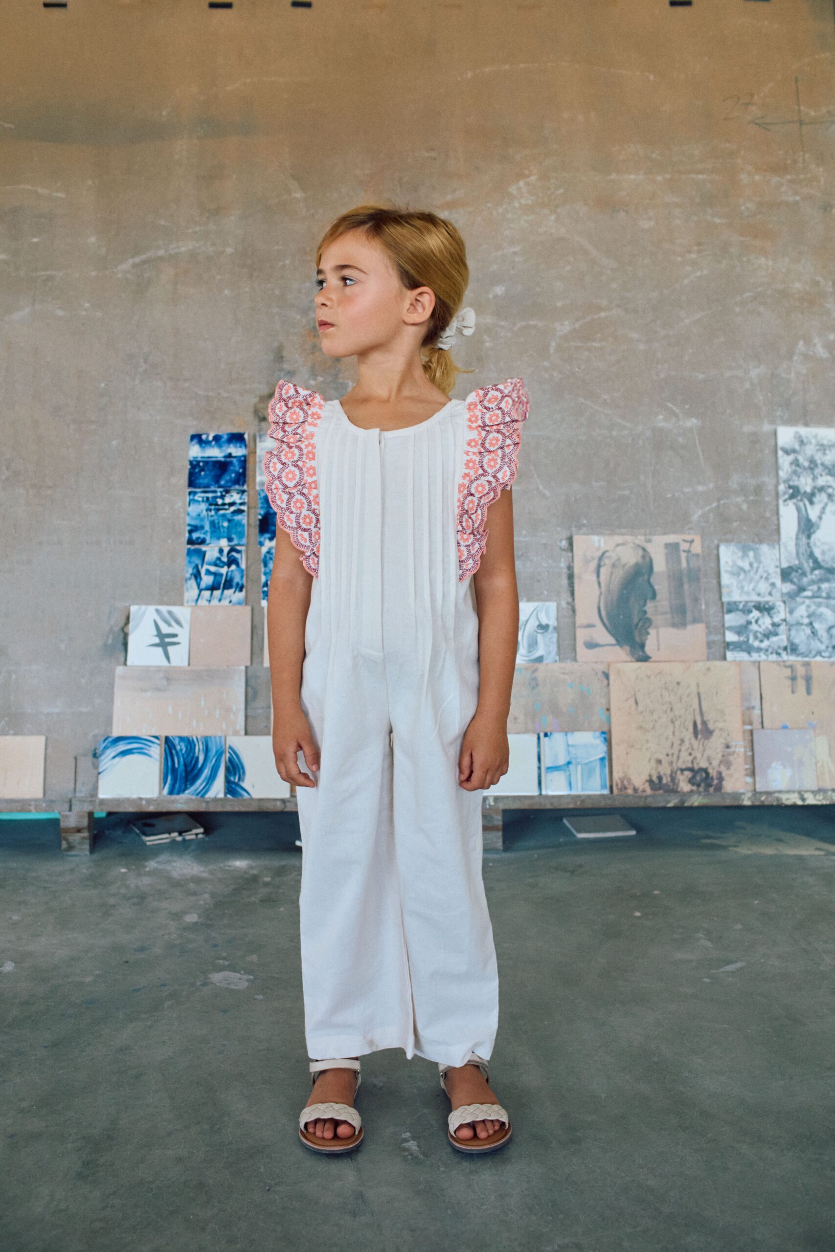 Este mono blanco combina comodidad y elegancia para el día a día de tu niña. Presenta volantes con detalles en bodado inglés en varios tonos de rosa, lo que le da un toque especial a la prenda.
