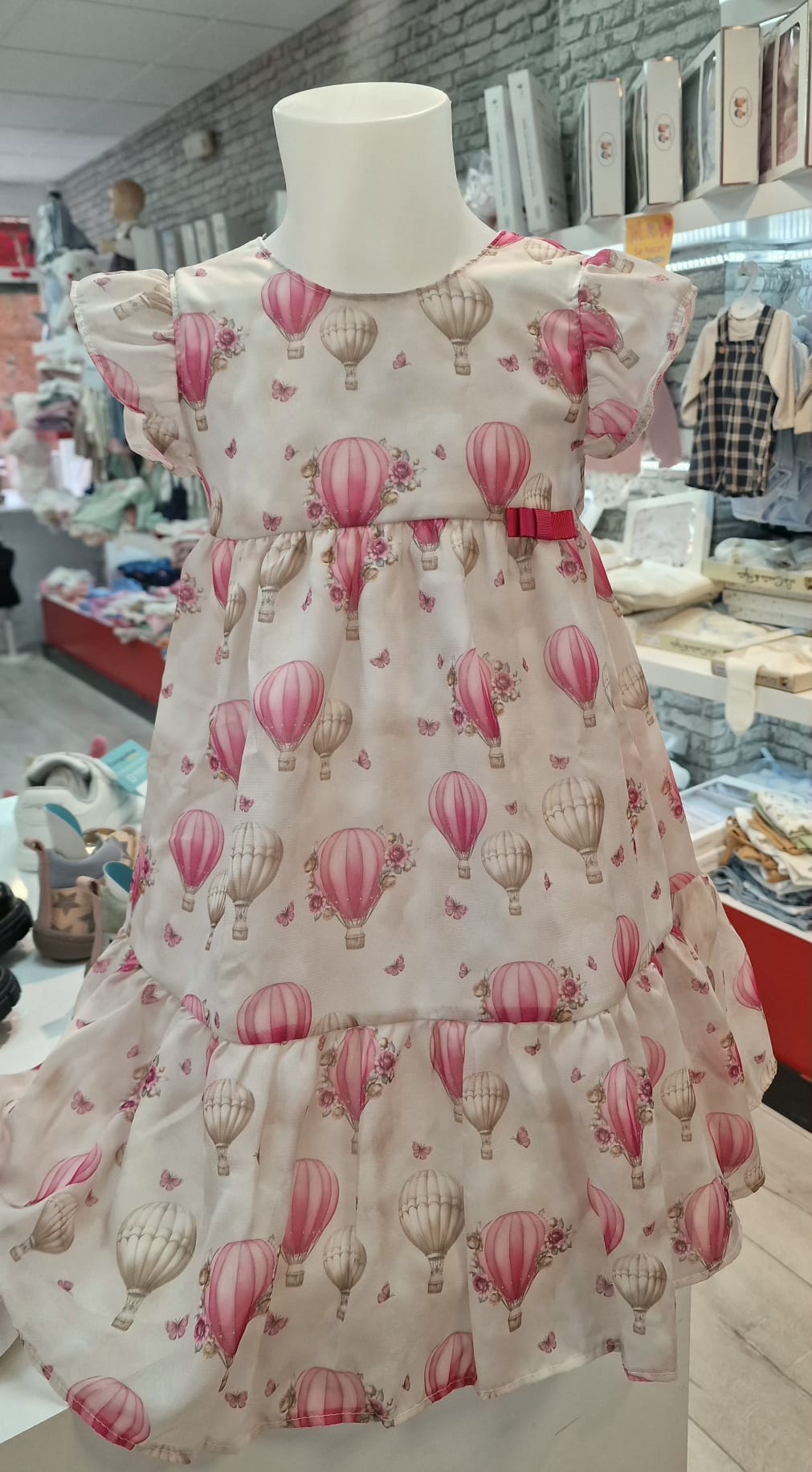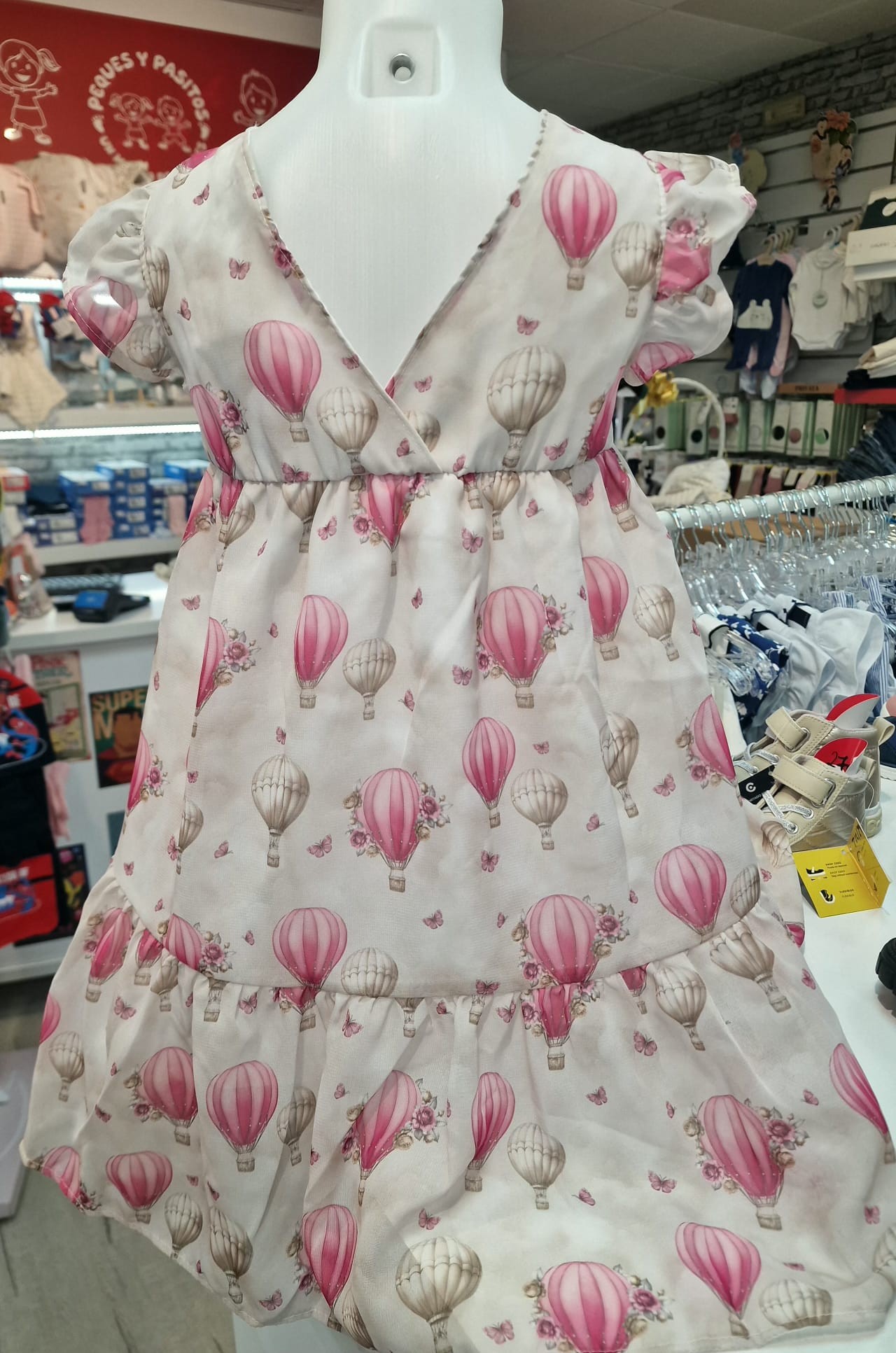 Estampado mágico presenta un delicado diseño de globos aerostáticos en tonos rosados que aporta un toque de fantasía y libertad