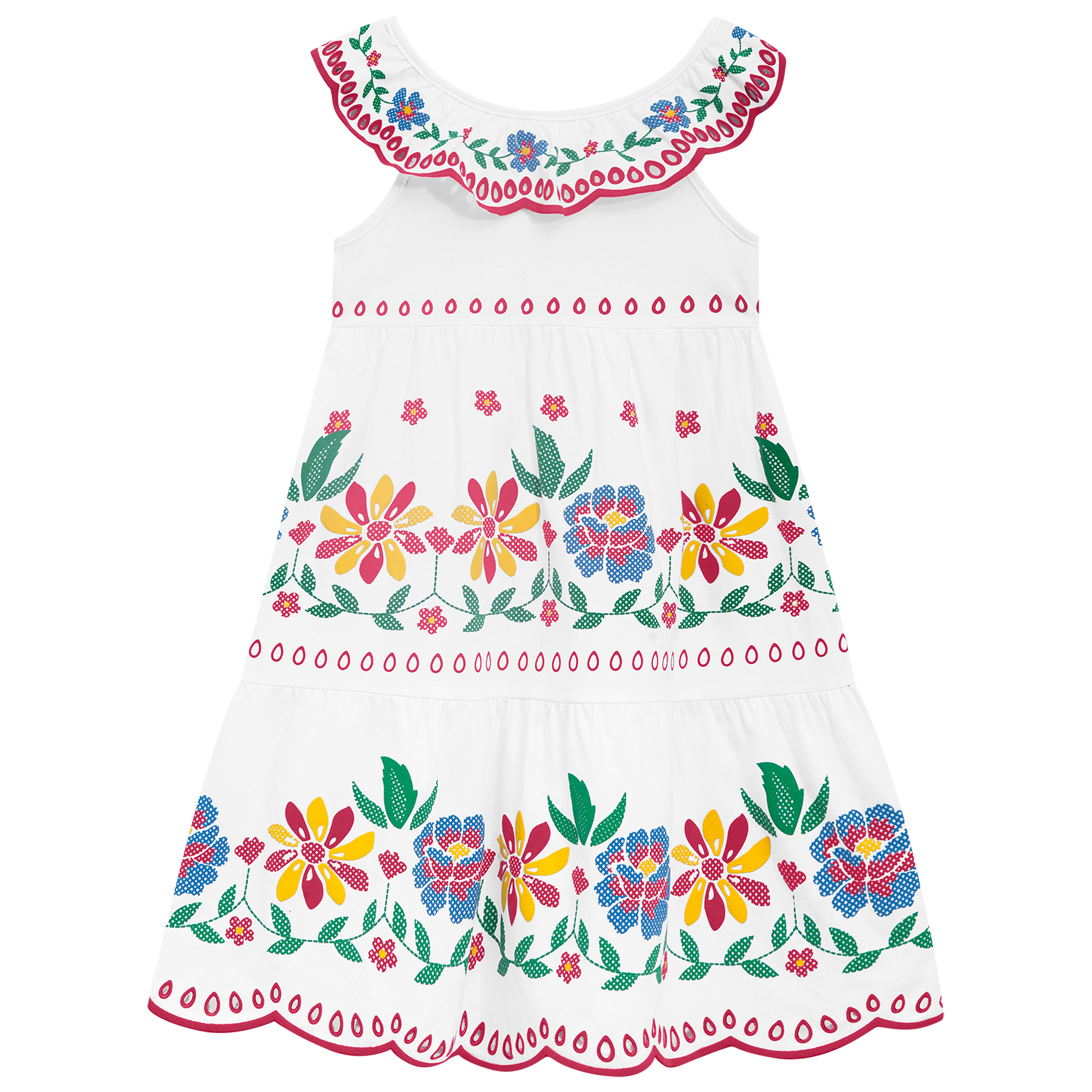 Bordados florales y perforado en el cuello y en el bajo del vestido .
