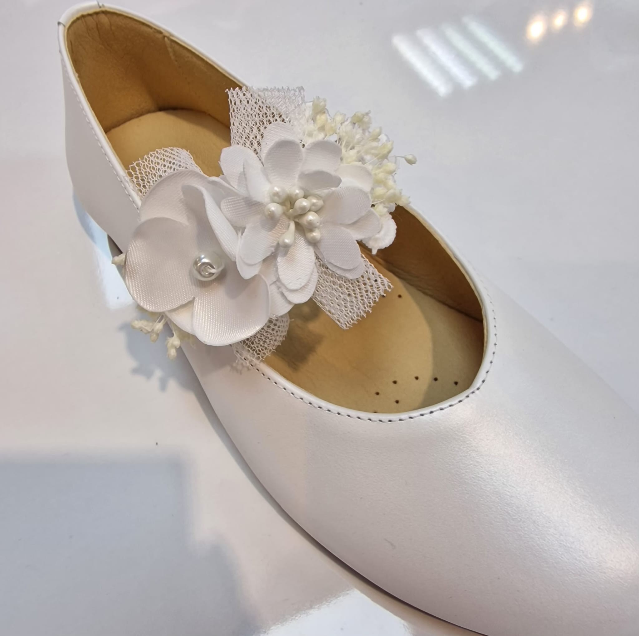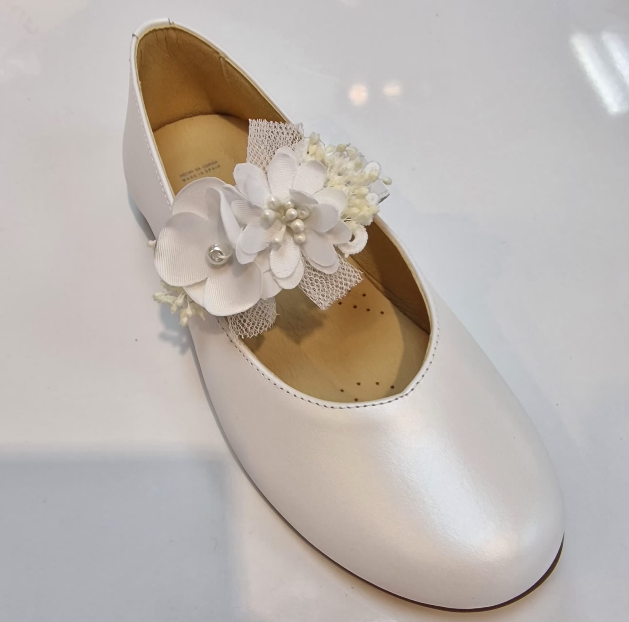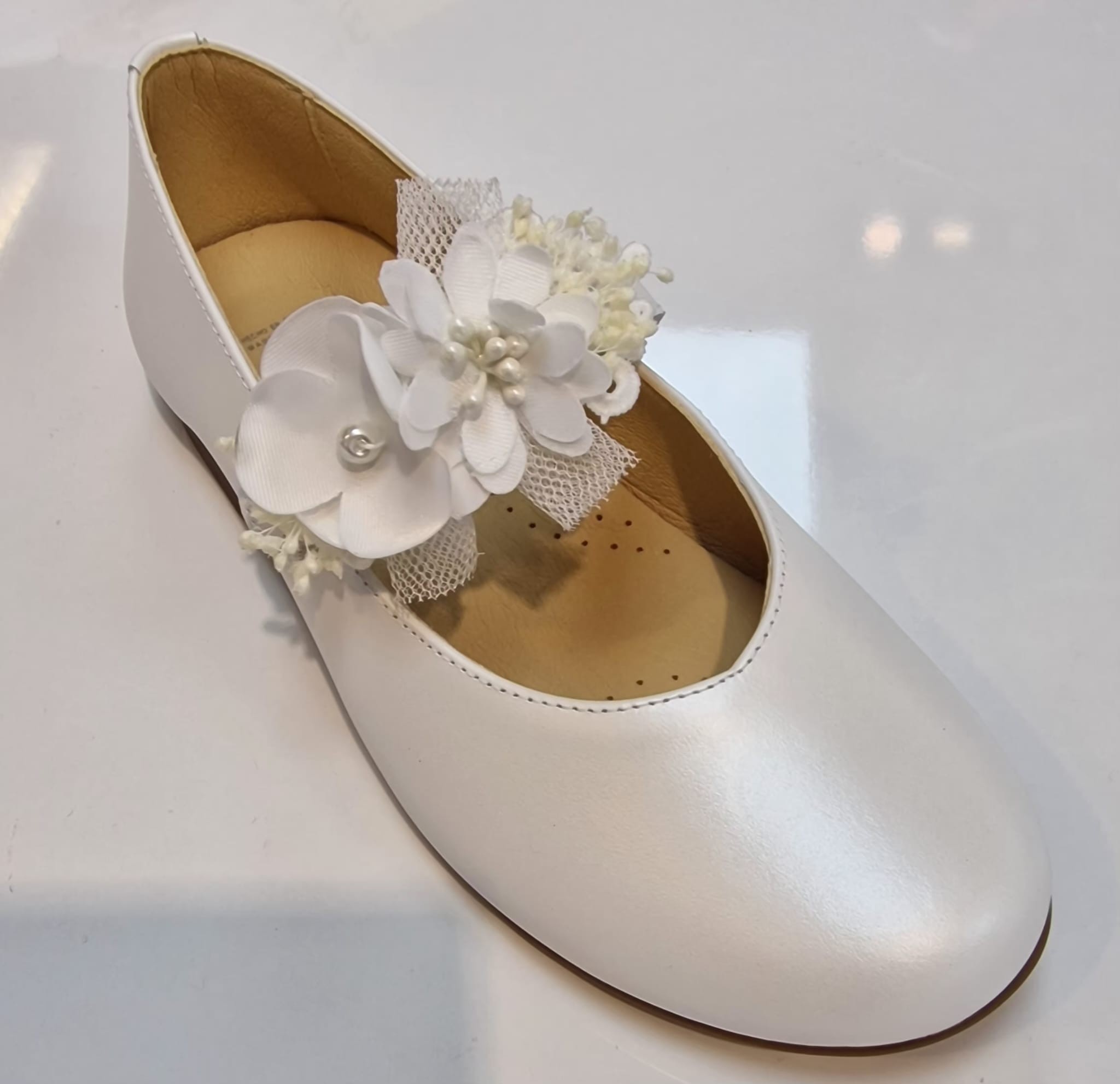 Hechos en piel nacar blanco, tienen un acabado suave y elegante, perfecto para acompañar cualquier vestido de comunión o de vestir para ceremonia.